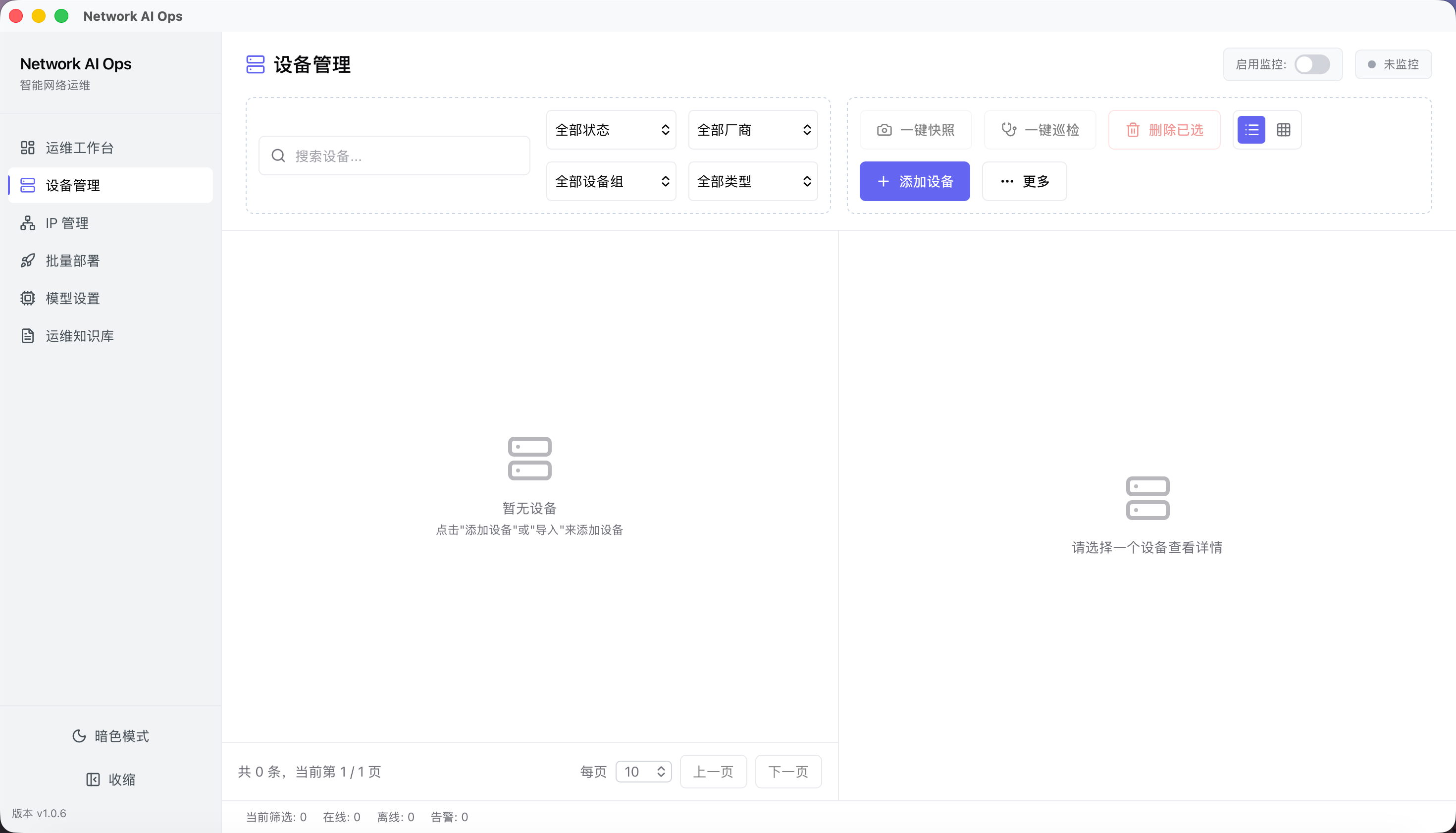 以下界面截图来自当前产品版本,覆盖运维工作台、设备管理、IP 管理与批量部署四个核心入口。